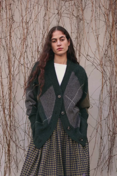 Crafted from 90% yak for a soft, brushed finish, showcasing a modern argyle design in subtle olive and grey tones on a forest green base. Relaxed fitting, with refined shaping from ribbing along the V-neckline, hem and cuffs. Finished with dark mock horn buttons along the centre-front placket. Size up for an oversized fit.