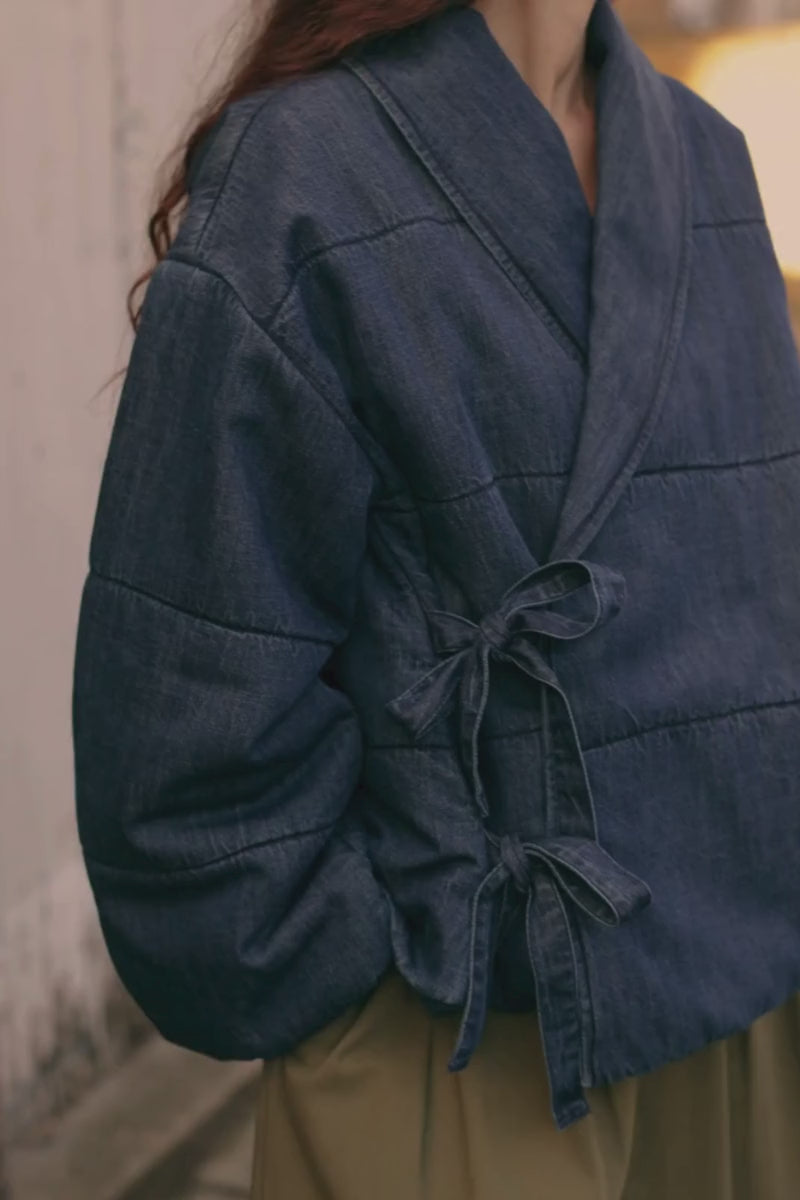 Lightly-quilted denim in a mid-dark blue wash. A kimono-inspired silhouette, featuring a cross-over front with tie-fastenings, wide sleeves and a shawl collar. Fully lined in blue cotton stripe.